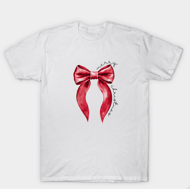 We use DTG Technology to print Christmas Ribbon Merry Christmas T Shirt .